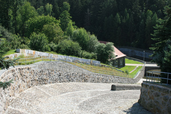 .. und fließt dann die steilen Kaskaden hinab. Doch im Normalfall bahnt sich das Wasser den Weg durch zwei Kanäle, die mit Flachschiebern ausgesstattet sind. In dem einen Kanal gelangt es zu Turbinen, in dem anderen direkt in den Fluss.